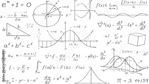 Chalk drawing effect. Math formulas and graphs on white background. Seamless pattern. Vector illustration.