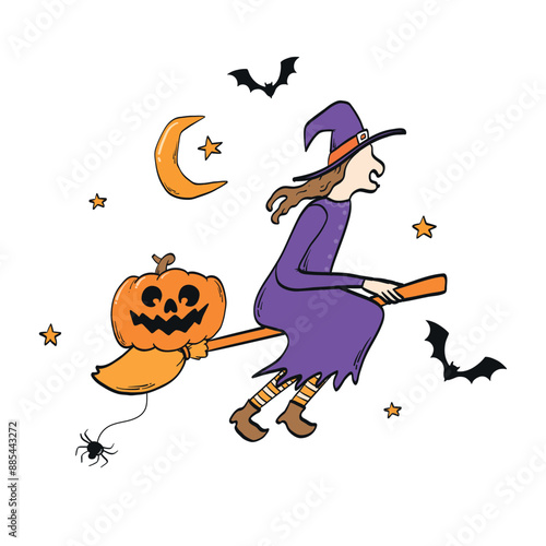 Charmed little witch girl child cartoon Halloween character vector illustration. Small sorceress holding carved pumpkin jack-o-lantern tradition autumn symbol