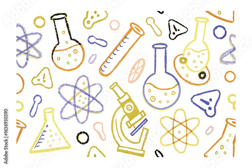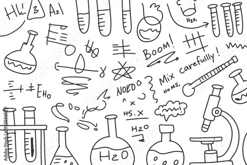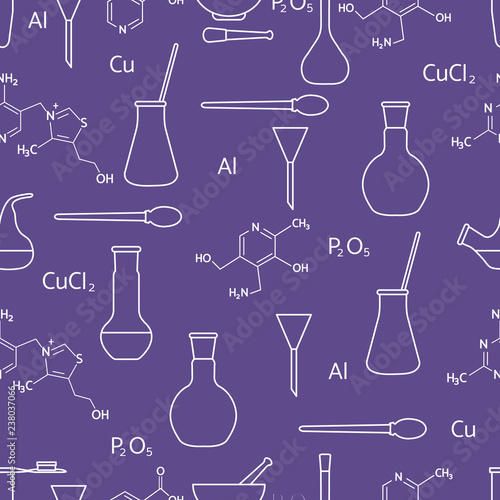 Chemistry formulas and flasks on white background. Seamless pattern. Vector illustration.