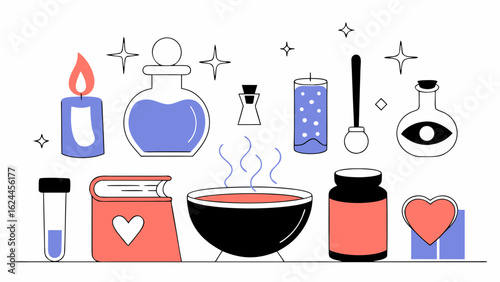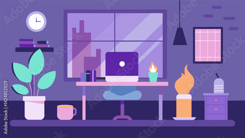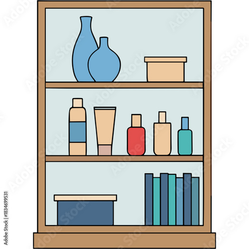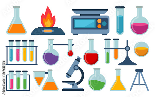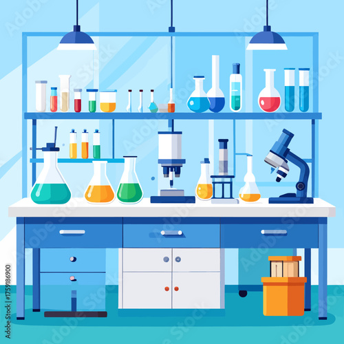 Science lab vector poster template. Chemistry laboratory interior with microscope, flasks, beakers and burner on shelves. Equipment and glassware for laboratory experiment, flat style illustration.
