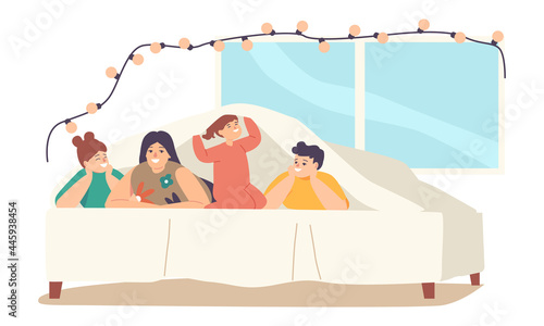 Child fears vector. Little boy afraid of ghosts illustration. Sleepless kid sitting on bed under blanket suffering from insomnia. Frightened children and terrible nightmare