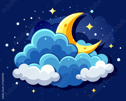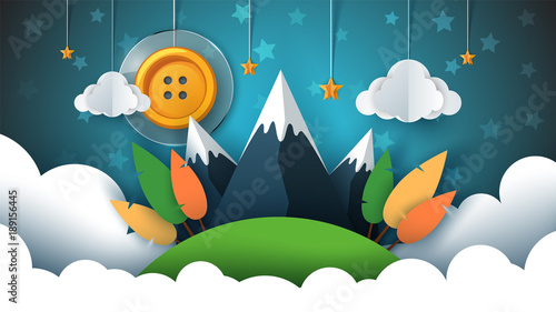 Child touching the stars in the sky. Kids dream vector illustration in paper art origami style. Paper cut design concept. Fairy tale wallpaper in baby room.