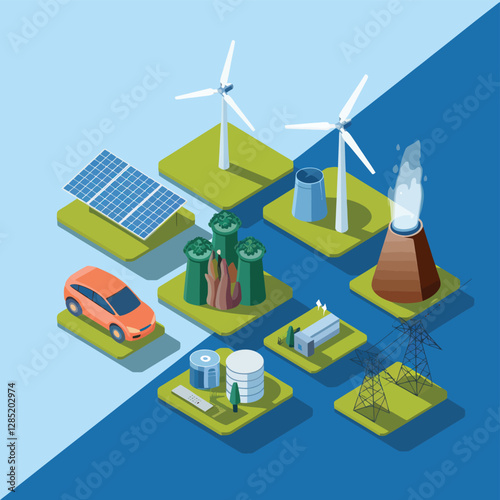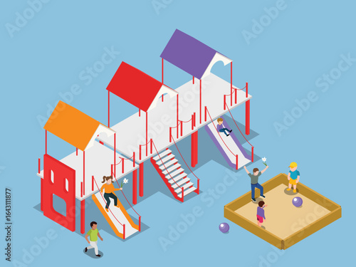 Children playground icon set, vector flat isolated illustration. Isometric jumping trampolines, slide, swing, spring rocker, carousel, sandbox, etc. Play, sport and park equipment for outdoors.