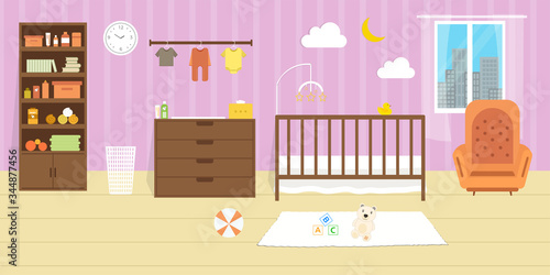 Children playing hide and seek with babysitter at home vector. Woman educator looking for hidden kids in private kindergarten living room illustration. Active fun time and childhood