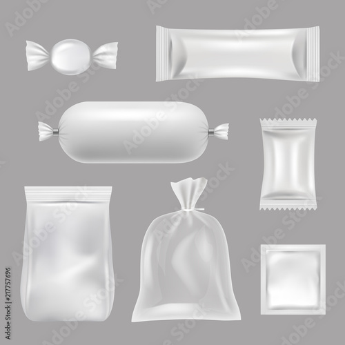 Chocolate and candy packaging mockup set, vector illustration isolated on transparent background. Realistic white blank plastic foil food storage bags, chocolate bar, chocolates and lollipop wrappers.