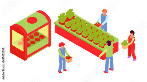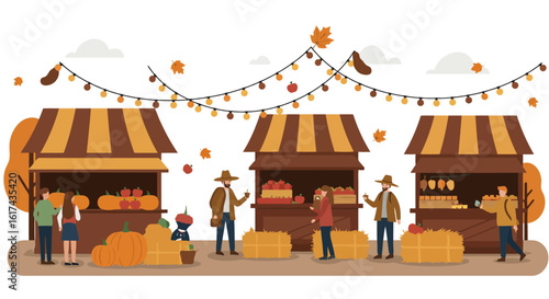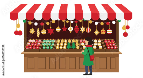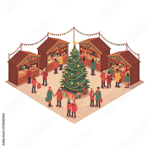 New Year fair set flat vector illustration. Winter street market stalls and vendors. Happy people drinking mulled wine, buying Christmas gifts, biscuits, ice skating near decorated city Christmas tree