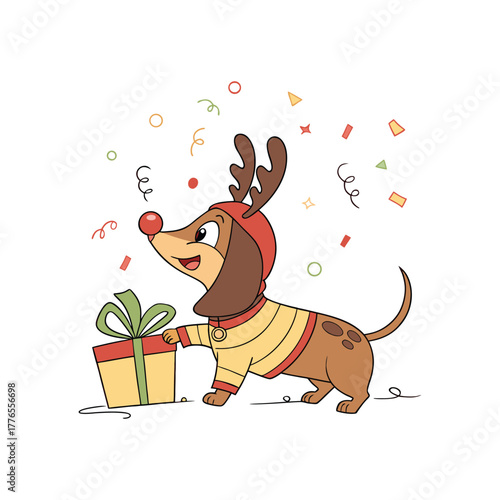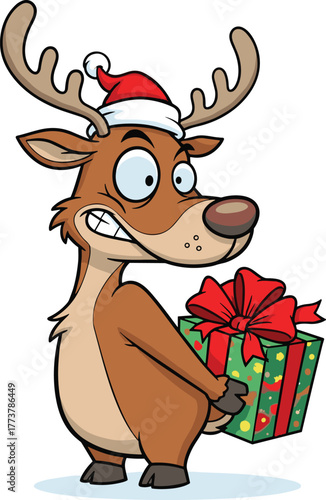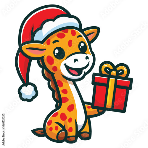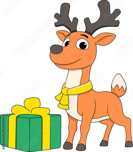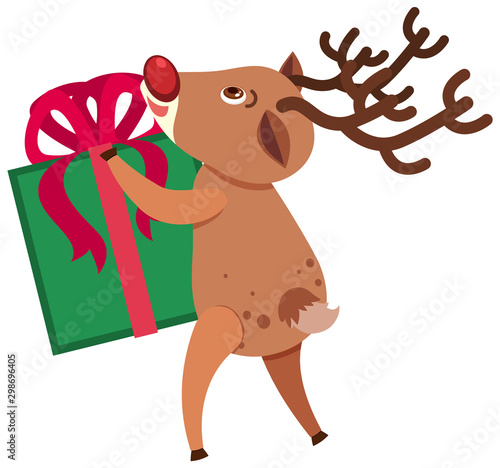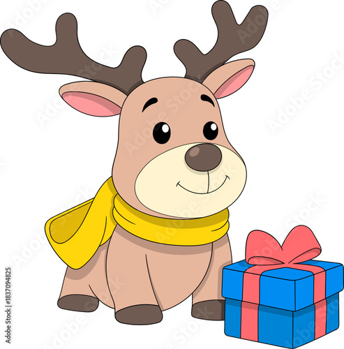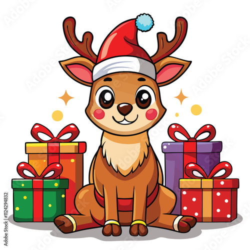 Christmas cow character wearing warm scarf and lots of gift box vector icon isolated on white background.