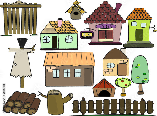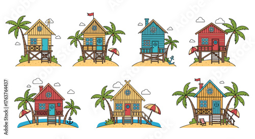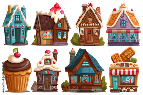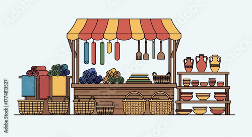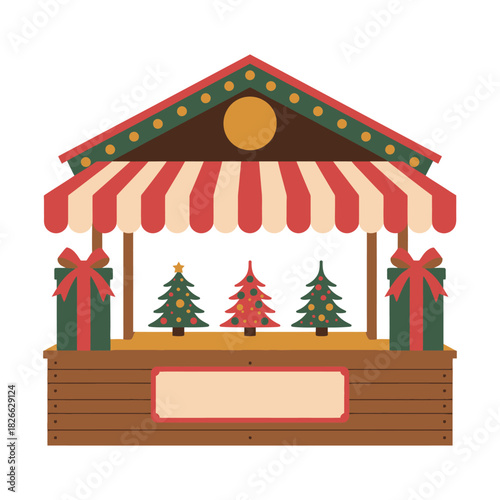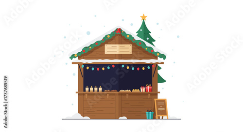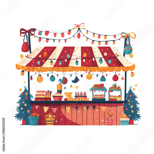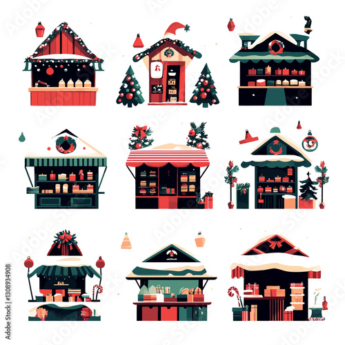 Christmas fair set, flat vector illustration. Winter street market stalls with mulled wine, grilled food, christmas gifts, gingerbread biscuits. People ice skating, visiting New Year fair, having fun.