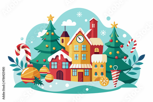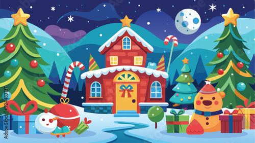 Christmas gifts, vector illustration in paper art style. Open magic box with xmas decoration explosion, winter night forest landscape with snowy trees and gift boxes.