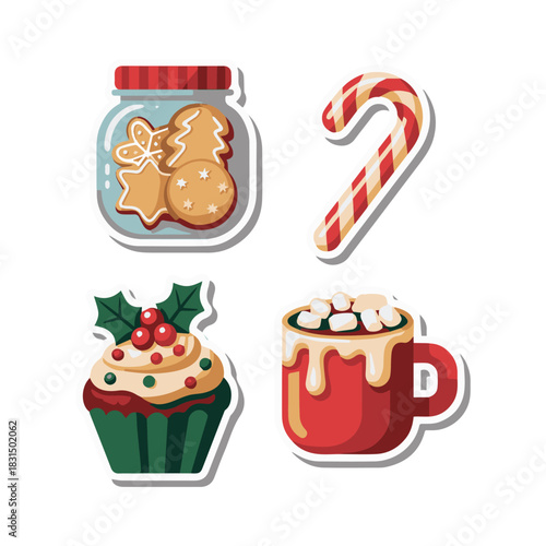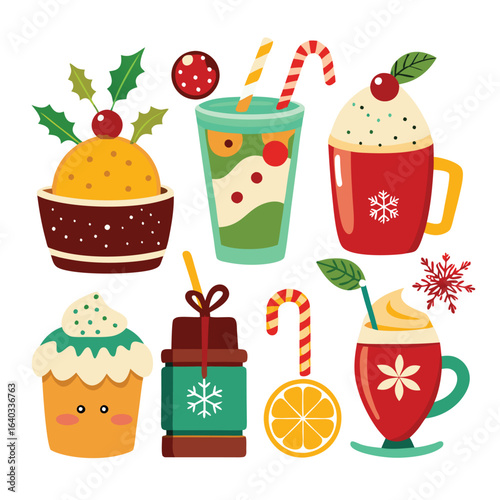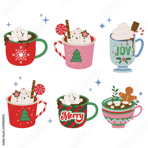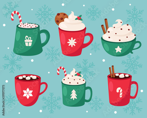 Christmas holiday coffee mug with hot drinks vector set. Cocoa with marshmallows, winter warming beverage as espresso, hot chocolate, cappuccino, latte and mulled wine isolated illustration