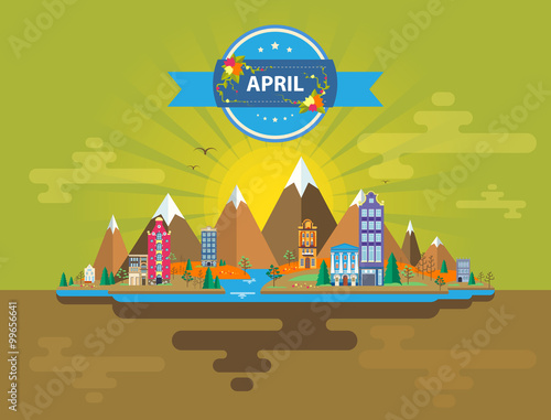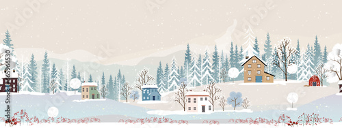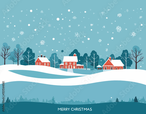 Christmas holiday season. Small town in snowfall. City and mountain landscape background. Vector illustration in flat style design. Cards and banners for Christmas celebration