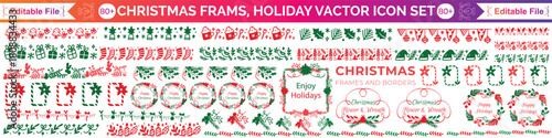 Christmas photo booth props, party decoration set, flat vector isolated illustration. Santa hat, beard, glasses, gift box, Christmas stocking, tree, wreath, holly berry, mitten, candy cane headband.