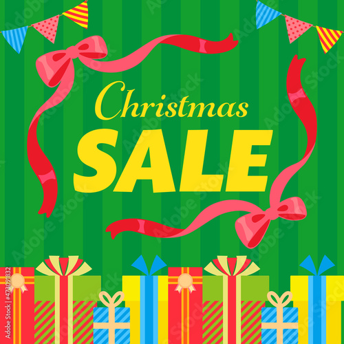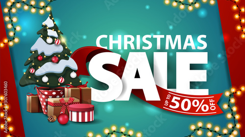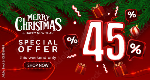 Christmas sale poster template, vector illustration in paper art modern craft style. 50 percent discount promotion red website banner with christmas tree branches, angels, gift boxes.