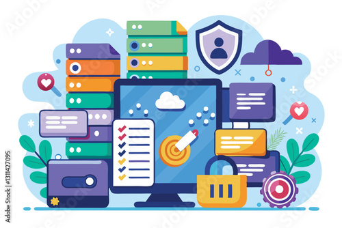 Cinema industry vector flat illustration. Screen with play button, camcorder, tickets, globe, popcorn, 3d glasses. Cinematography concept for web banner website page etc