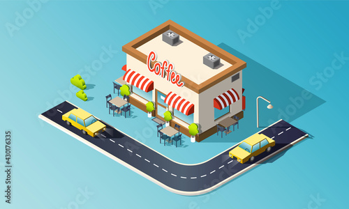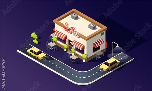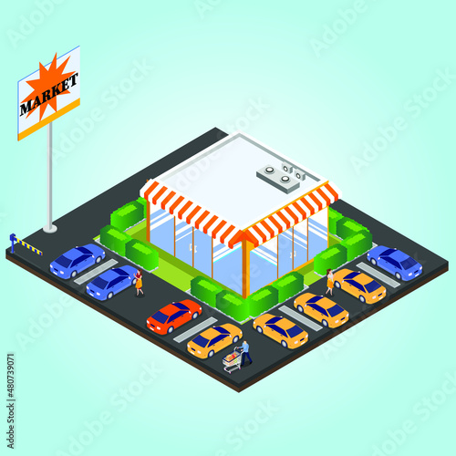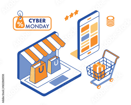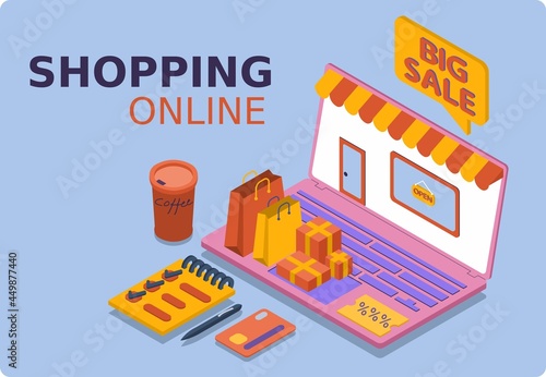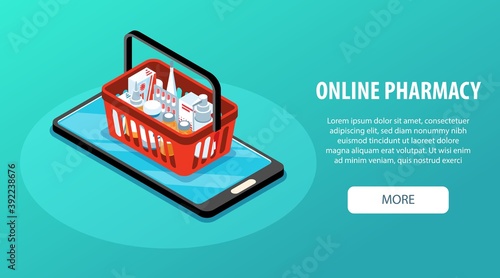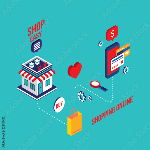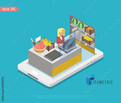 Booking cinema tickets online concept vector isometric illustration. Movie theater symbols clapperboard, popcorn, 3D glasses, soda, tickets, buy now button placed on smartphone screen.