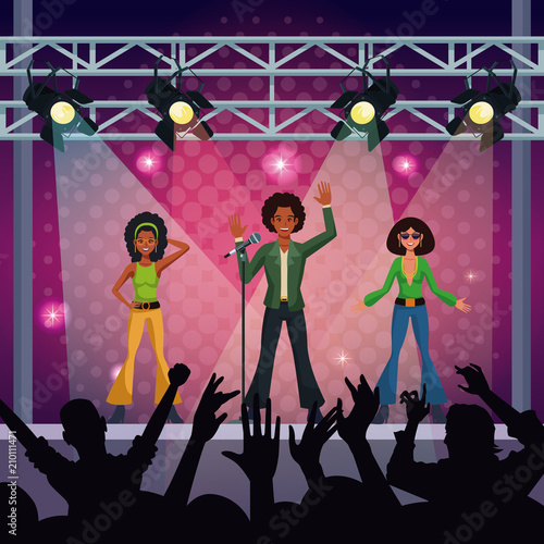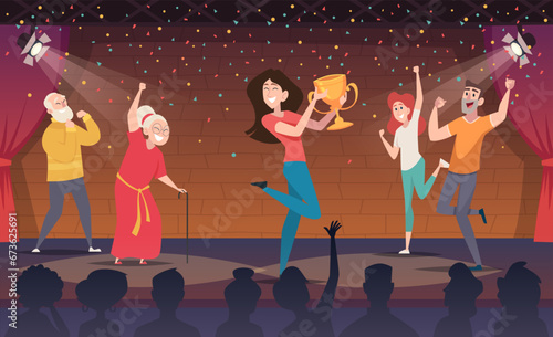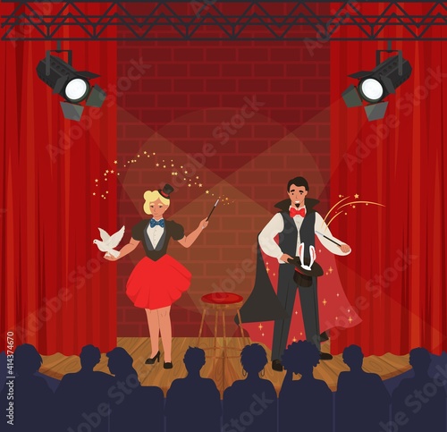 Male and female characters illusionists and magicians performing tricks with dove, rabbit, magic wand, black cylinder hat on circus stage, flat vector illustration. Magic show, circus performance.