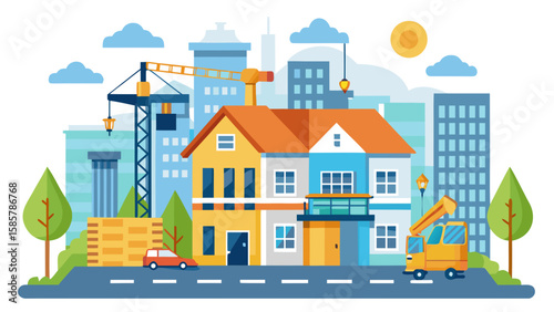 City drone delivery concept vector illustration. Quadcopters transporting packages, food or other goods. Flat linear style design poster, flyer for drone delivery company.