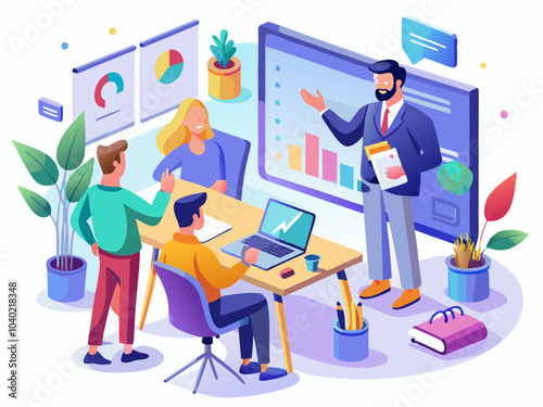 City planning and urban development process. Professional team of architects making, analyzing and discussing building project. People meeting for cityscape creation isometric vector illustration