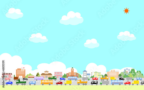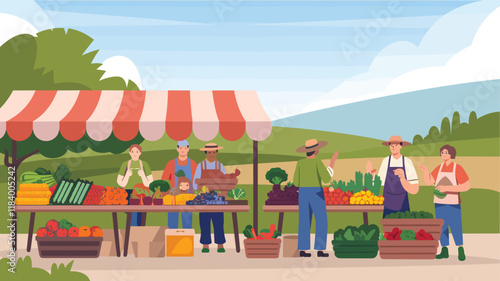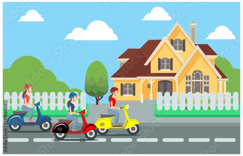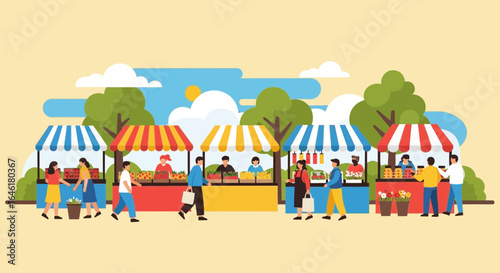 City public park concept vector illustration. Icecream salesman selling ice cream cones, kids playing ball, woman walking dog, street sweeper with broom. Flat style design.