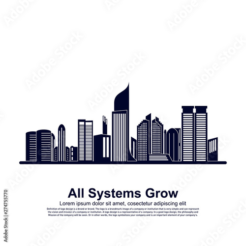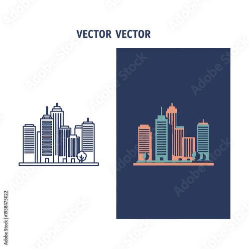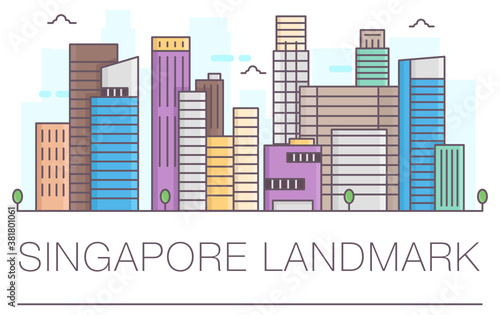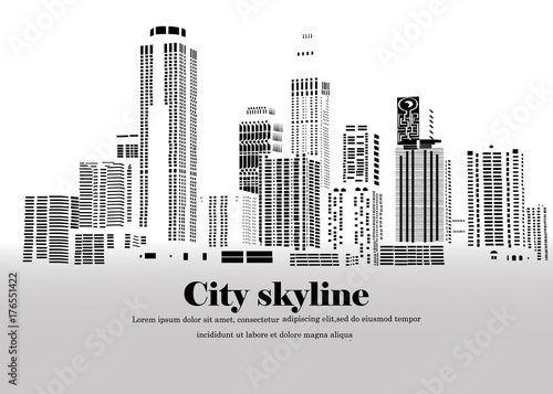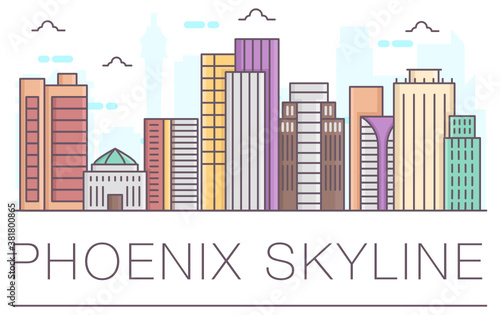 Vector illustration of city skyline background. Travel poster with flat linear style architectural buildings, skyscrapers, welcome lettering and place for text.