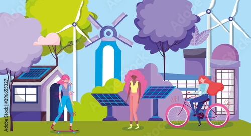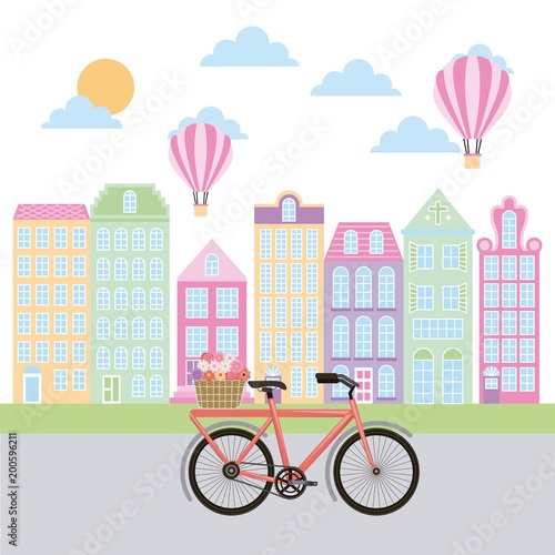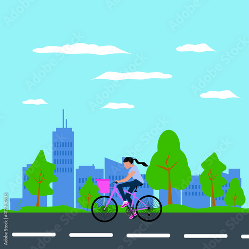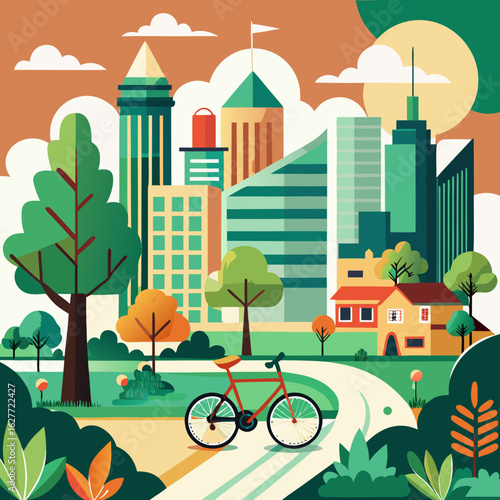 City street concept vector illustration in flat style. Street food cart or tricycle coffee bike, sports ramp and people buying coffee to go, riding bicycle and skateboard. Flat style design.
