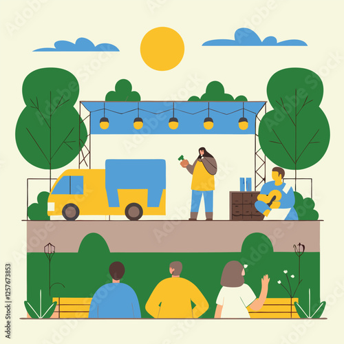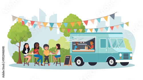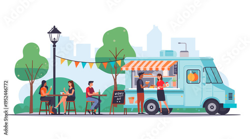 Vector set of city street concept design elements. Urban street with taxi stand, cafe, park and embankment with ice cream truck and coffee bike, people taking rest, buying food. Flat style design.