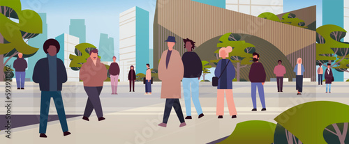 City street with coffee shop, cafe, grocery store buildings and people walking with dogs, sitting at table, shopping, flat vector illustration. Urban street architecture.