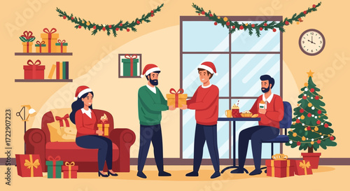 City street with apartment buildings and stores, sidewalk cafe, bakery, coffee shop, spa salon with visitors, shoppers, flat vector illustration. People walking down city shopping street.