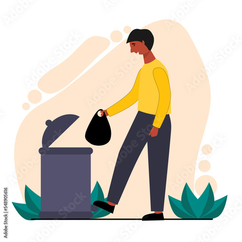 Janitor man throwing garbage bags into brown trash can recycling container, vector flat illustration isolated on white background. Cleaning company service concept for web banner, website page etc.