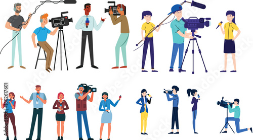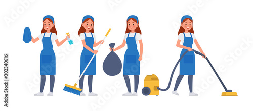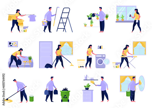 Cleaning company staff, male, female character set, flat vector isolated illustration. Cleaner lady, janitor man with home cleaning equipment. Floor and window washing, dusting, garbage collection.