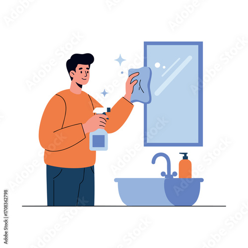 Cleaning company staff cleaner lady, janitor man with house cleaning equipment, vector flat isolated illustration. Window cleaning, laundry, ironing, dusting, doing vacuuming, garbage collection.