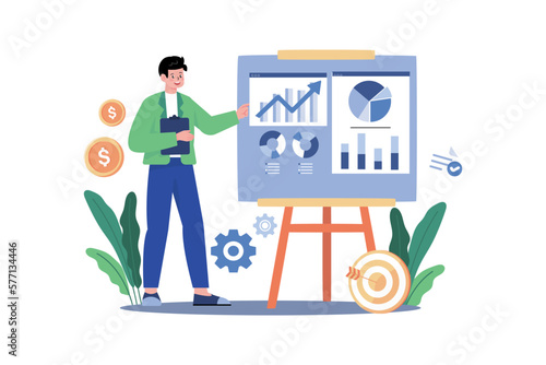 Vector illustration of professional cleaner male with cleaning service trolley and house cleaning supplies. Cleaning people flat style design element, icon isolated on white background.