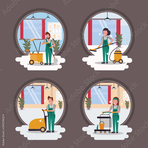 Cleaning service concept vector illustration in flat style. Housekeeping company team at work. People cleaning window, iron clothes, vacuuming floor and doing laundry.