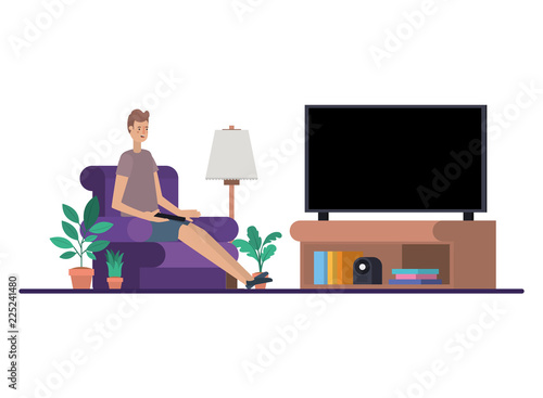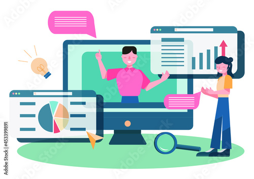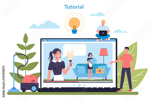 Professional home cleaning services, vector flat illustration. Male and female characters, cleaning company staff dusting home appliances and furniture, vacuuming carpet in living room.