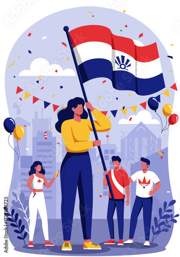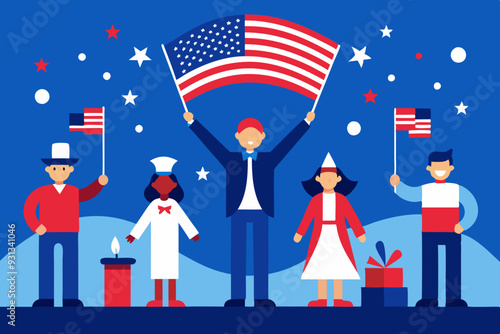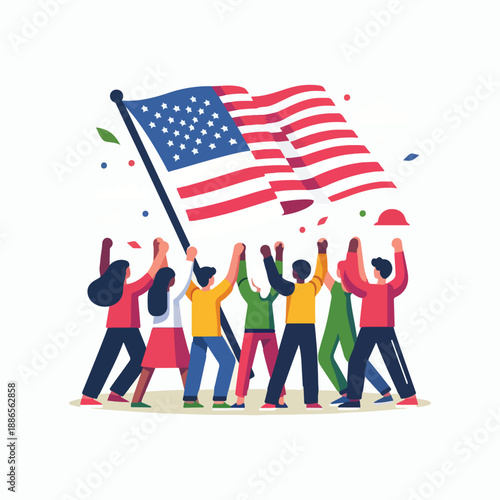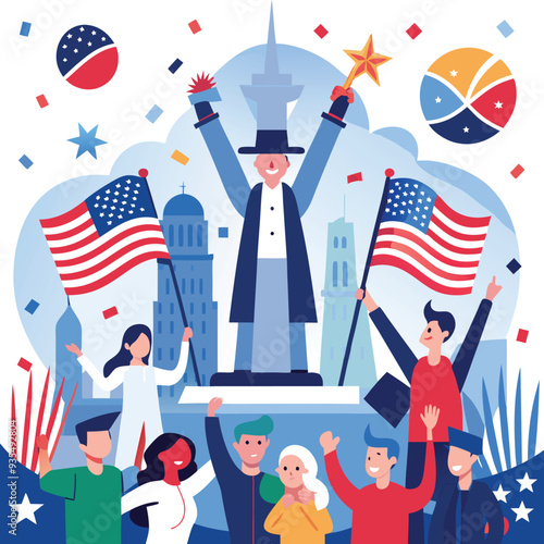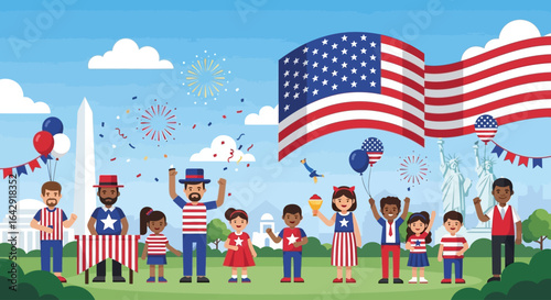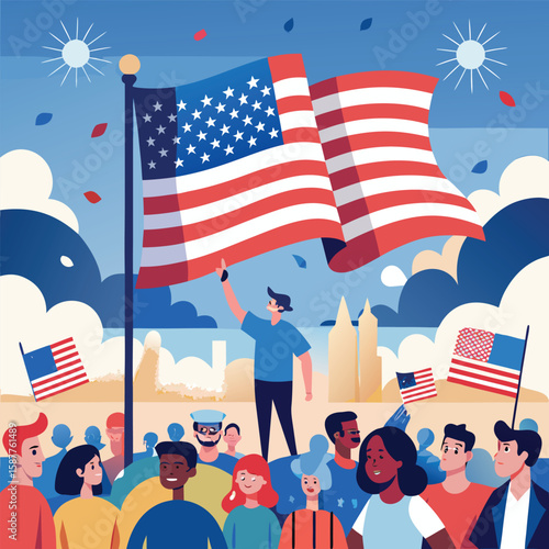 Closed borders to USA for immigration vector. People with luggage bag waiting for opening way to America illustration. Flag under closed with metal chain and lock over cityscape background design