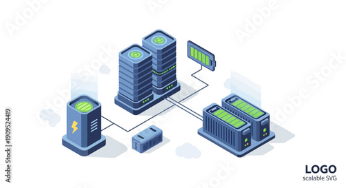 Cloud computing technology flowchart, isometric vector illustration. Cloud data hosting servers, digital folder, laptop, desktop computer, mobile phone.