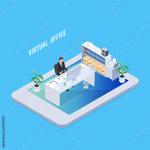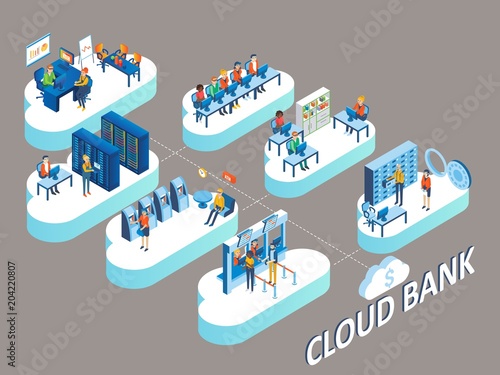 Cloud office concept. Vector isometric illustration of office rooms with personnel on clouds linked by connecting lines.