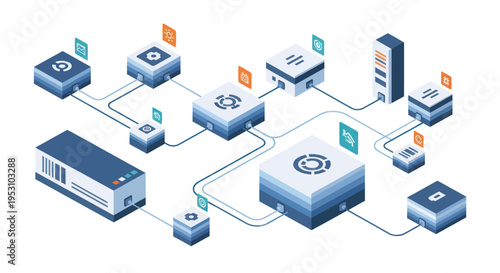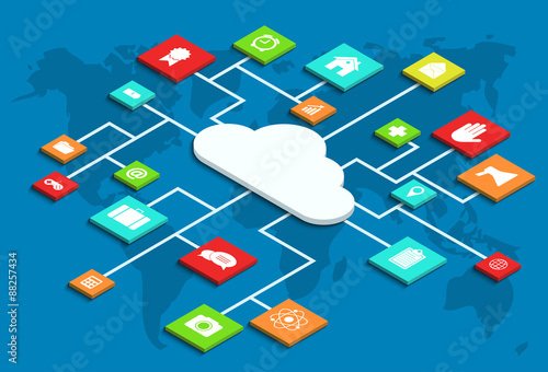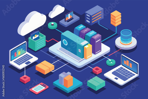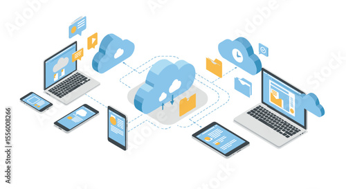 Cloud service flowchart. Vector flat 3d isometric illustration of network servers, internet router, laptop, mobile phone etc.