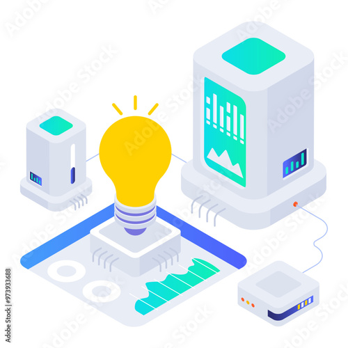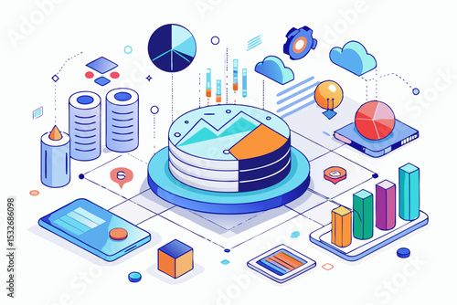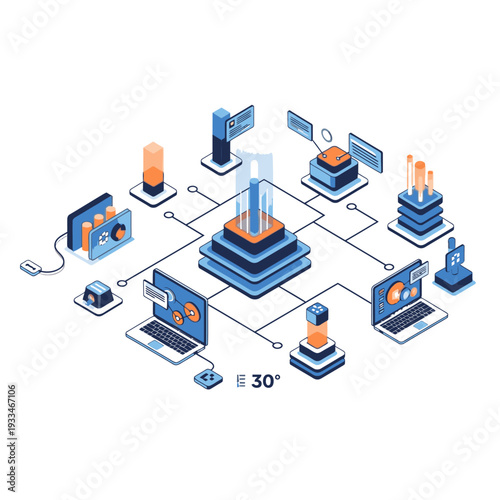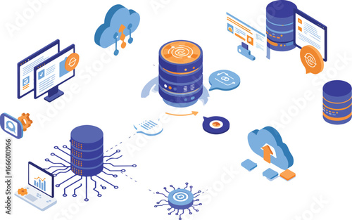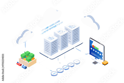 Cloud storage technology flowchart, isometric vector illustration. Computer data storage. Cloud synchronization services.