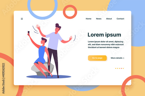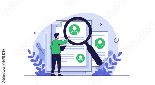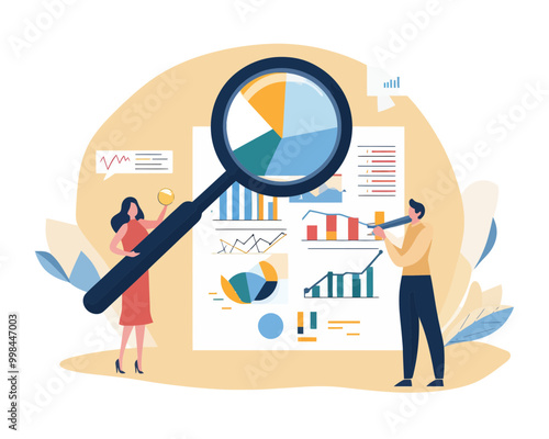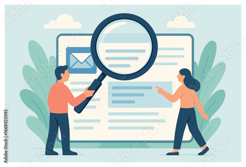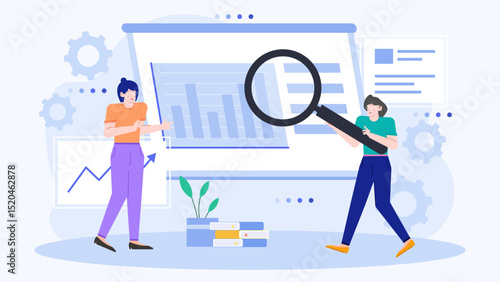Huge cloud and micro male and female characters with magnifying glass, file folder, laptop computer, vector illustration. Cloud computing technology, the Internet concept for web banner, website page.