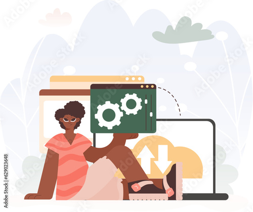 Huge cloud, robot, micro male and female characters with file folder, laptop computer, vector illustration. Cloud computing and artificial intelligence technologies concept for banner, website page.