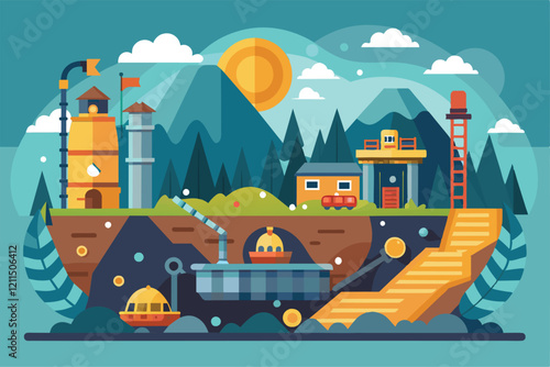 Coal mining set. Vector flat illustration. Mining industry icons with machinery, equipment and industrial plant smoking pipes. Coal extraction and transportation.