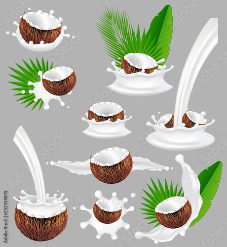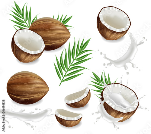 Coconut in chocolate splash. Vector realistic illustration. Nuts with chocolate splashing and pouring, palm leaves.