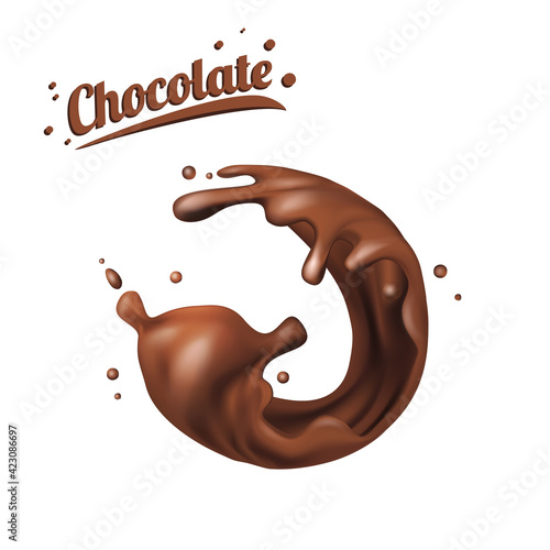 Coconut and splashing melted dark chocolate realistic vector icon. Design element for sweet products isolated on white background