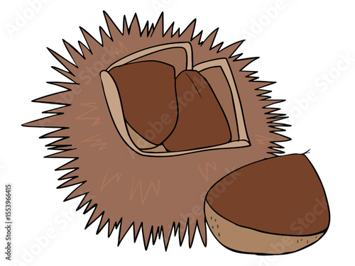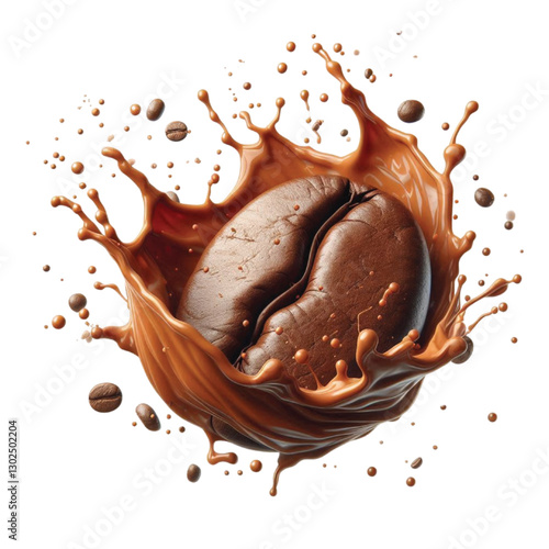 Coconut, green palm tree leaf and splashing melted dark chocolate realistic vector icon. Design element for sweet products isolated on white background