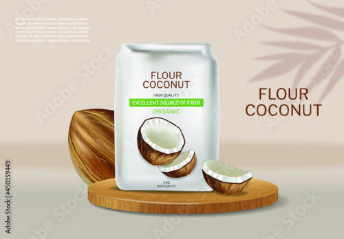 Coconut natural cosmetics, vector poster template. Realistic whole half coco, cream tube, jar, palm leaves. Organic coconut beauty skin care cosmetic product brand advertising composition with text.