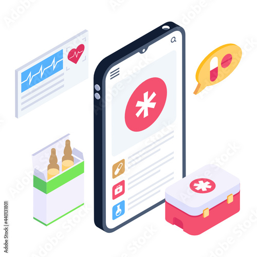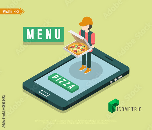 Coffee and bakery online concept. Vector isometric smartphone with food delivery app. Coffee, donut, cake, navigation map with pin marker and buy now button on smart phone screen.