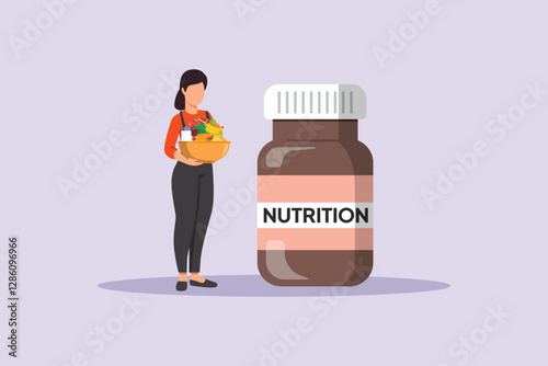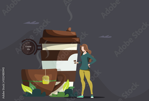 Vector illustration of customer buying coffee to go, smiling saleswoman with cups of coffee. Coffee house interior. Flat style design.