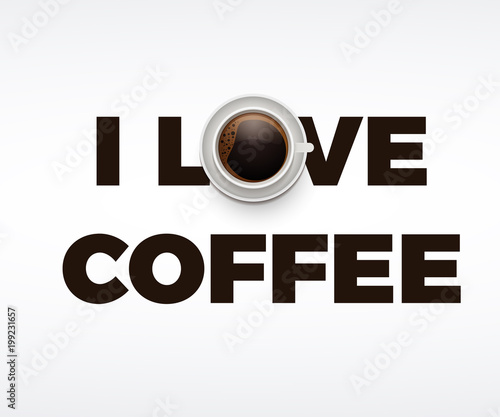 Coffee power concept vector realistic illustration. Top view cup of coffee on wood background. Coffee poster, flyer design template.