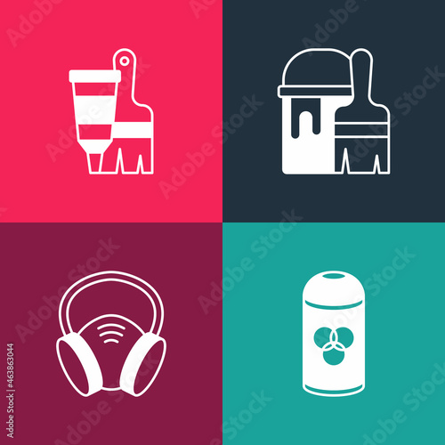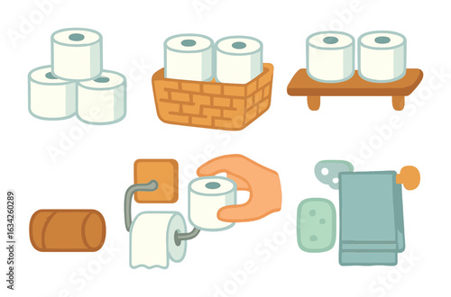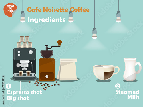 Coffee production vector flat illustration. Hand putting lid on glass pitcher, grinder, mug of drink with whipped cream, disposable cup, croissant, candies. Coffee with croissant poster, banner.